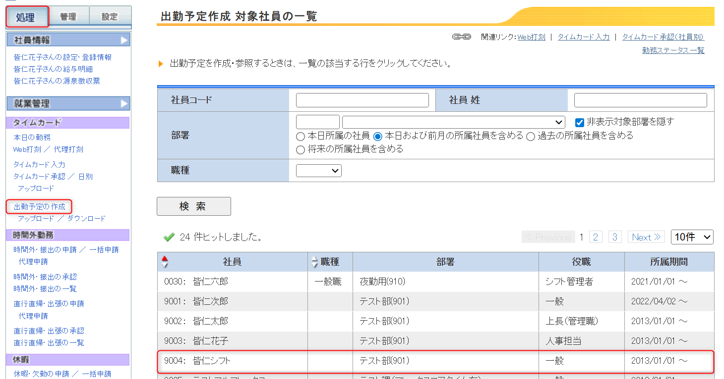 ①出勤予定の作成(処理タブ>就業管理>タイムカードマスタ>出勤予定の作成)にて