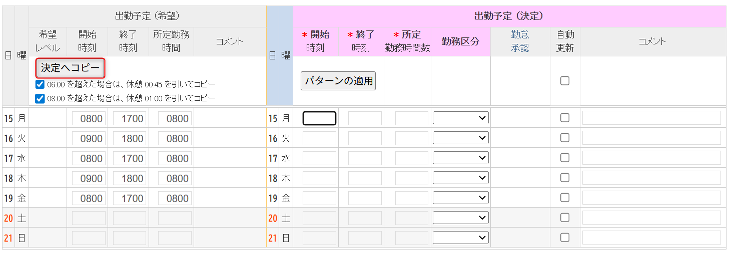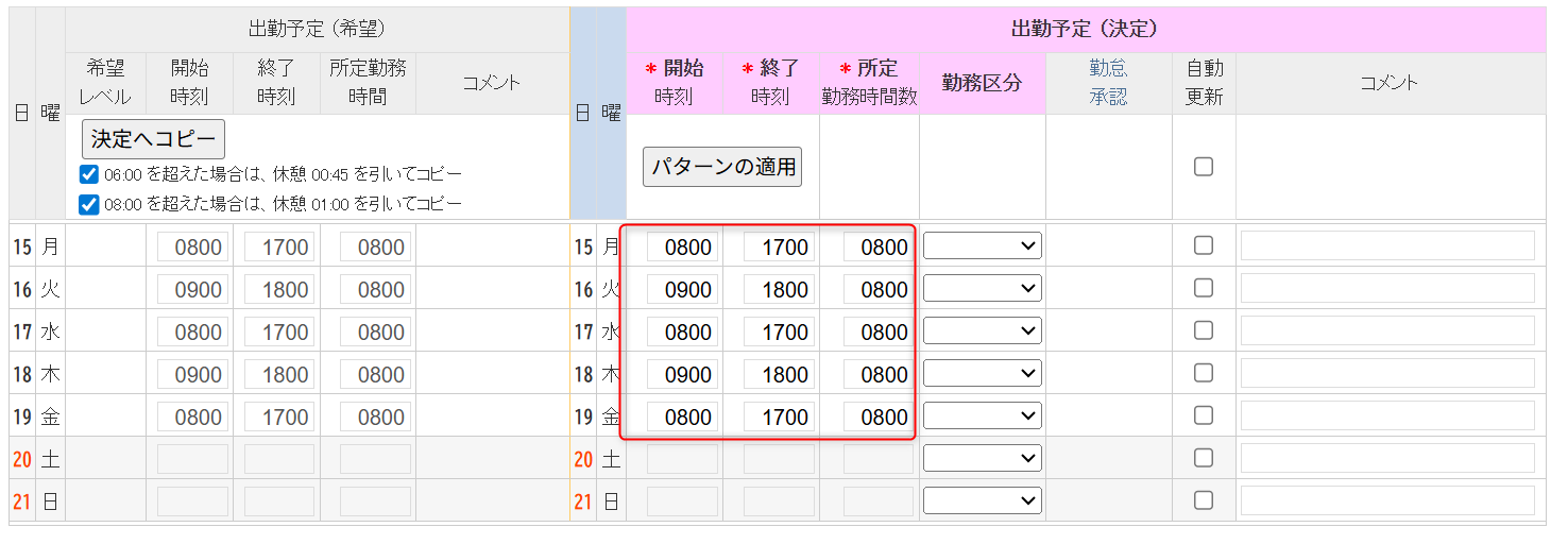 承認者は、[出勤予定の作成] 画面にて、本人の希望をそのまま反映して決定することも可能です。