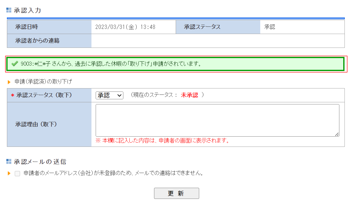 と記載がされていますので承認ステータス(取下)を「承認」とし[更新]をクリックします。