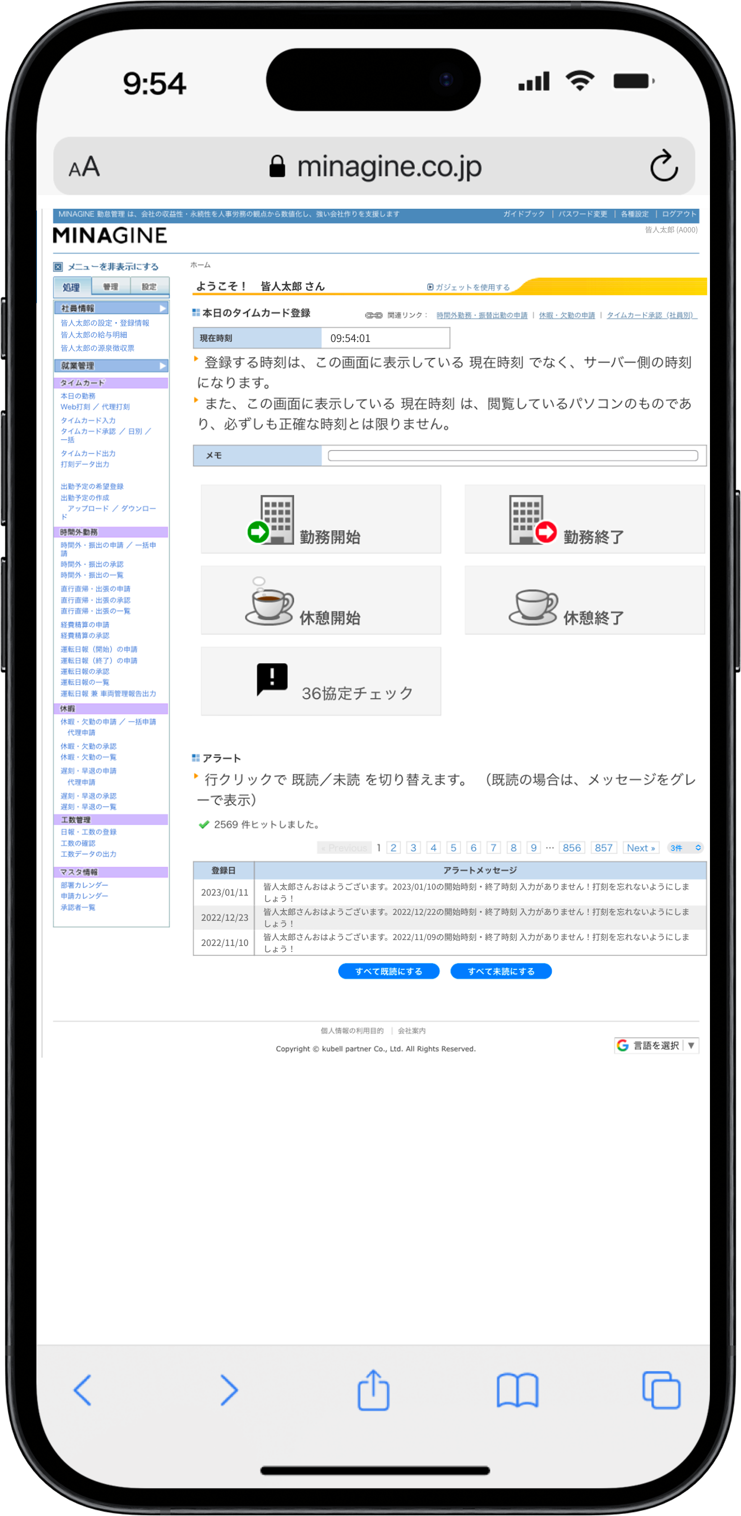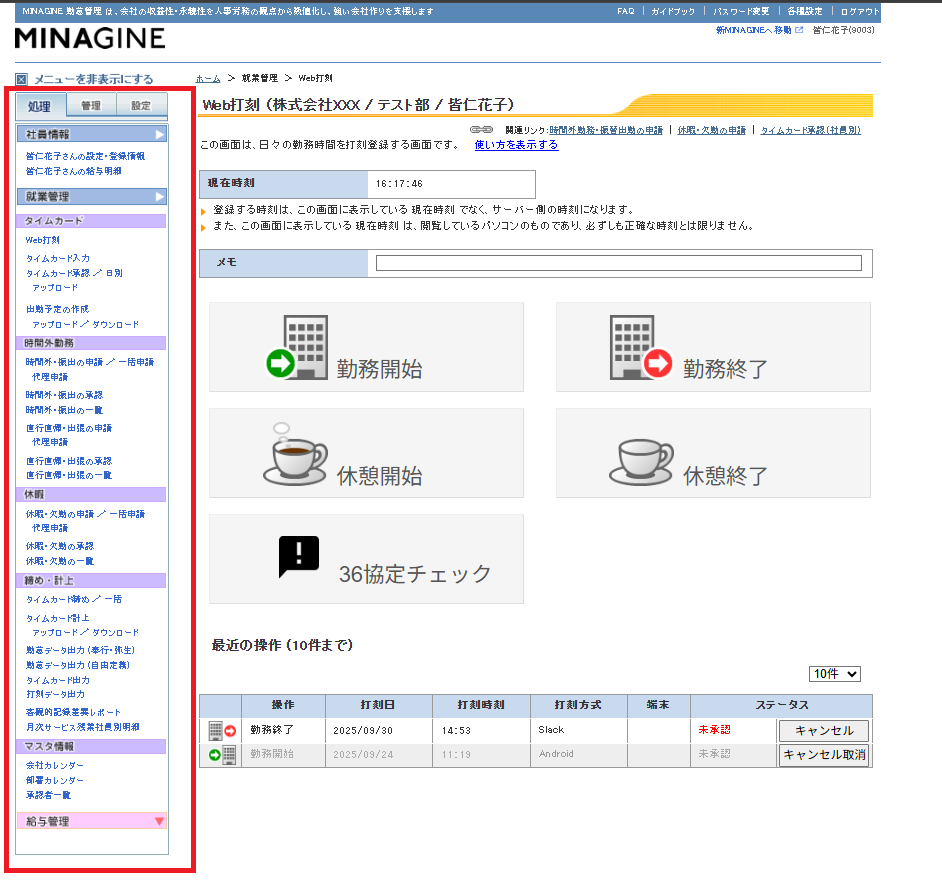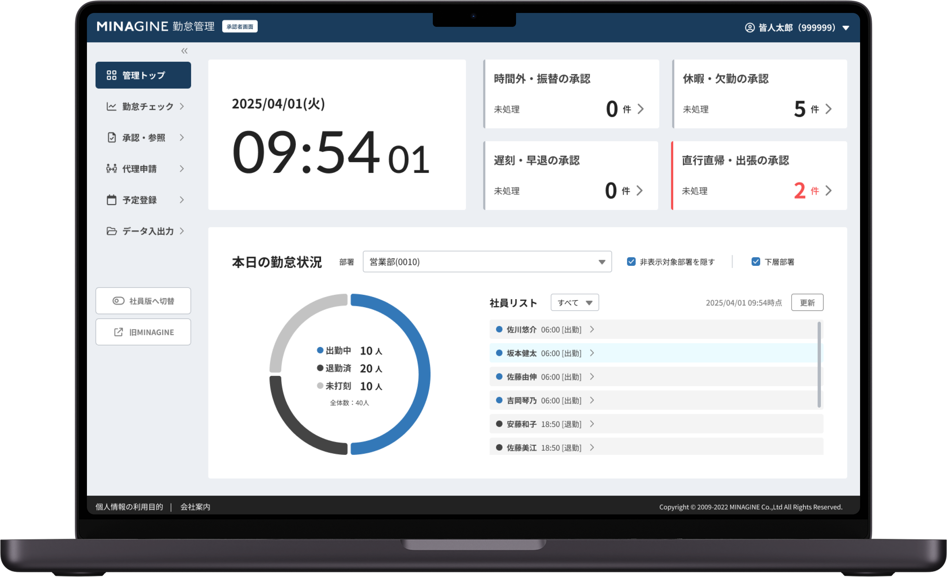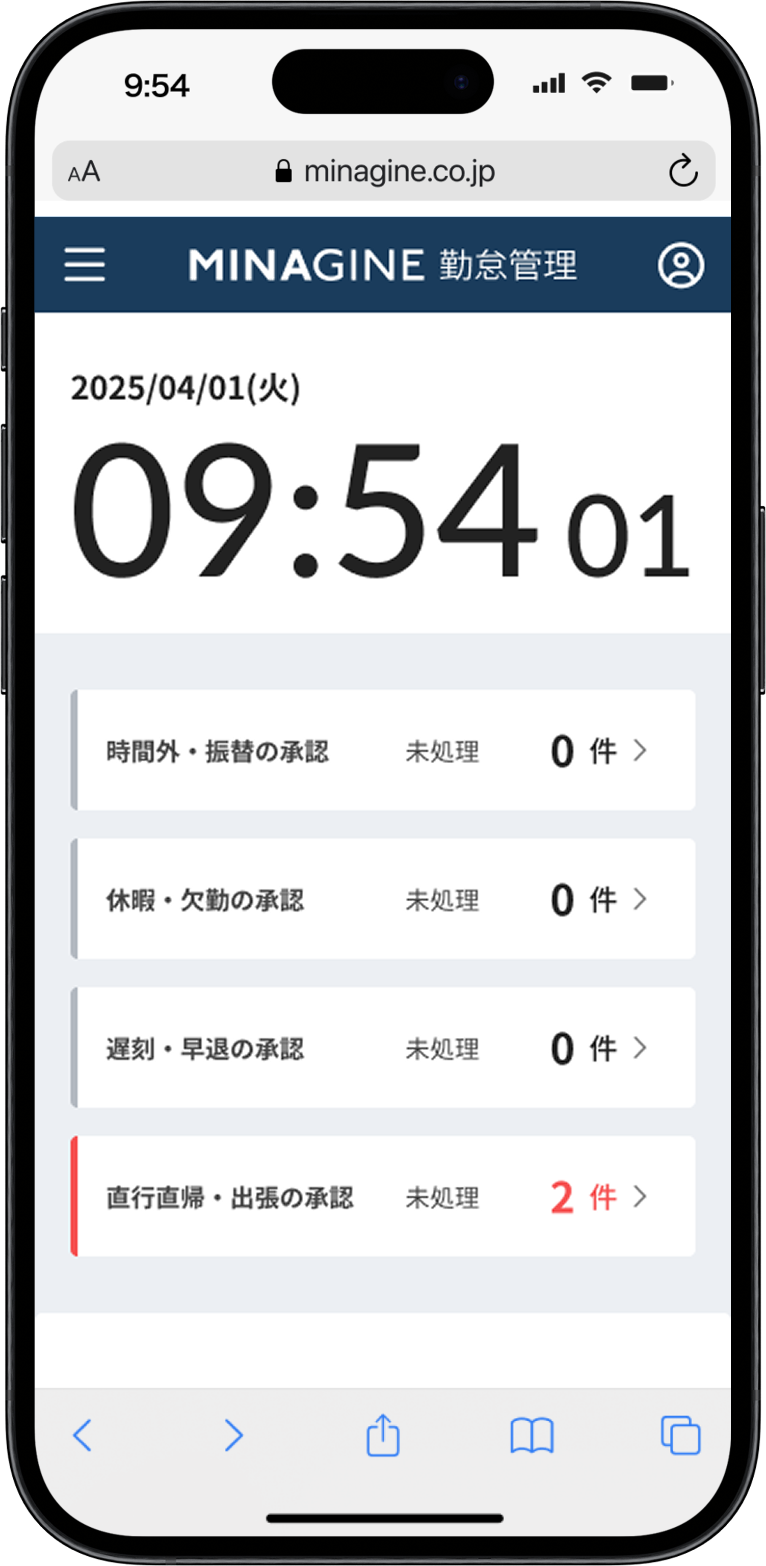 各承認の未処理件数、部下の本日の勤怠状況を把握出来ます。