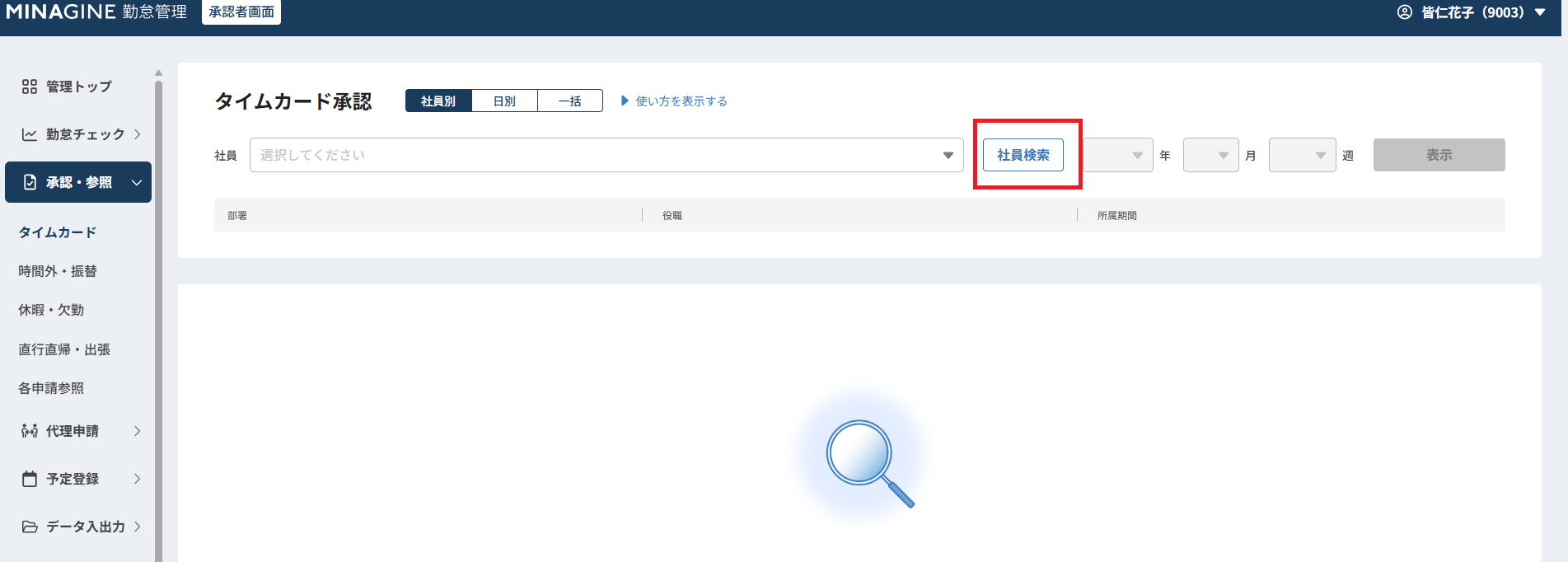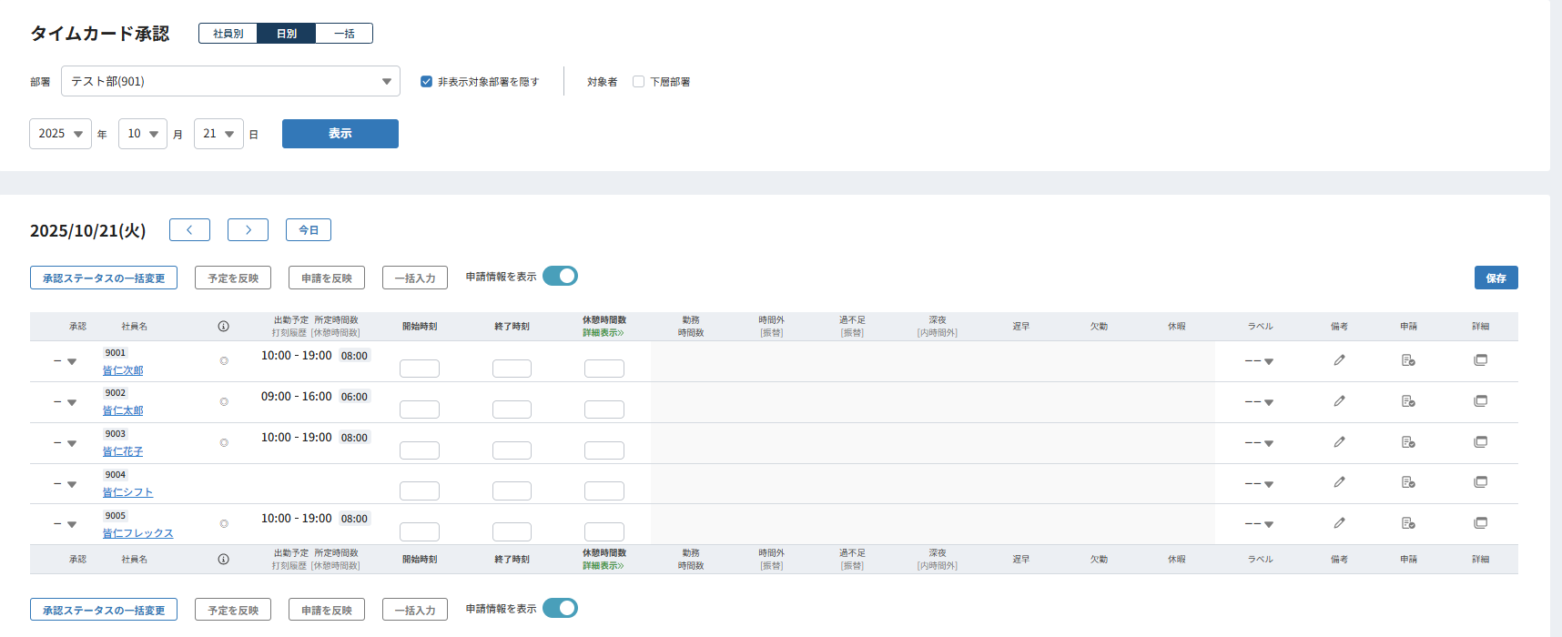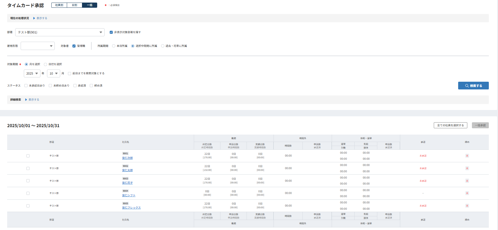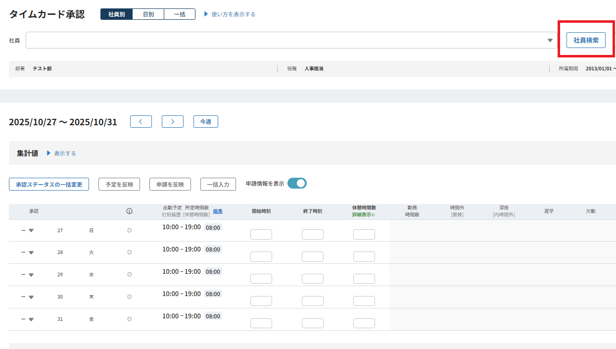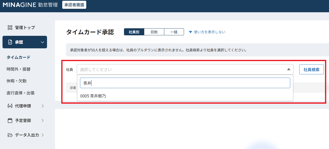 タイムカード承認画面にて「社員別」「日別」「一括」表示を選択できるようになりました。