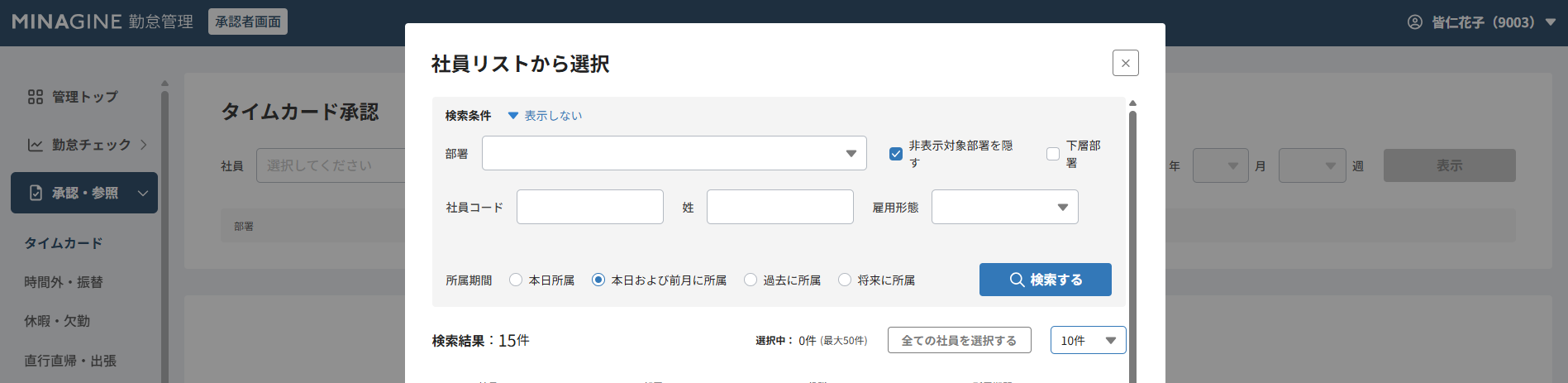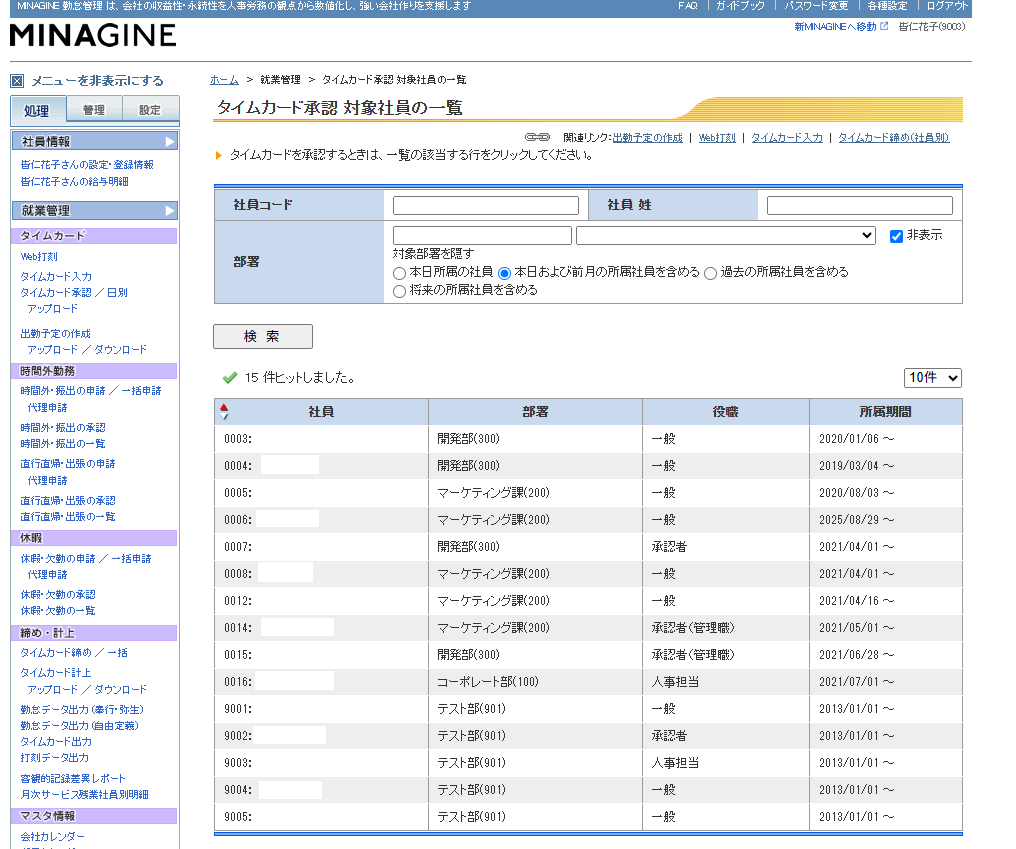 旧UIではタイムカード承認画面を開くと、社員の一覧が並びます。