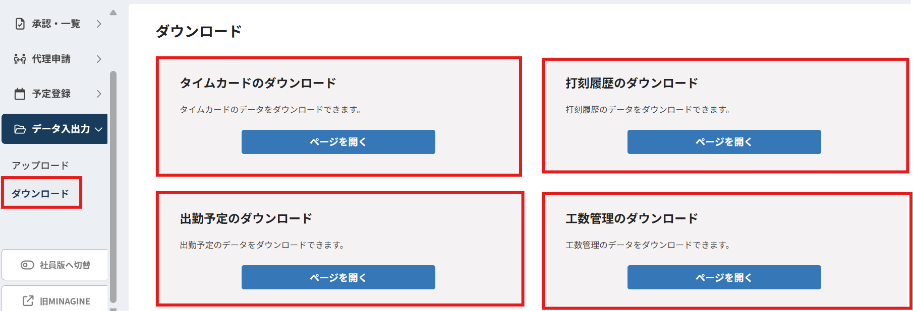 旧UIではデータのダウンロードとアップロードするメニューが別々で表示されておりましたが、