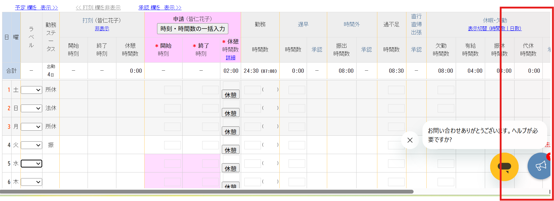 承認:初期非表示。タイムカード入力画面上で切替可能。(下図の赤枠部分で切替)