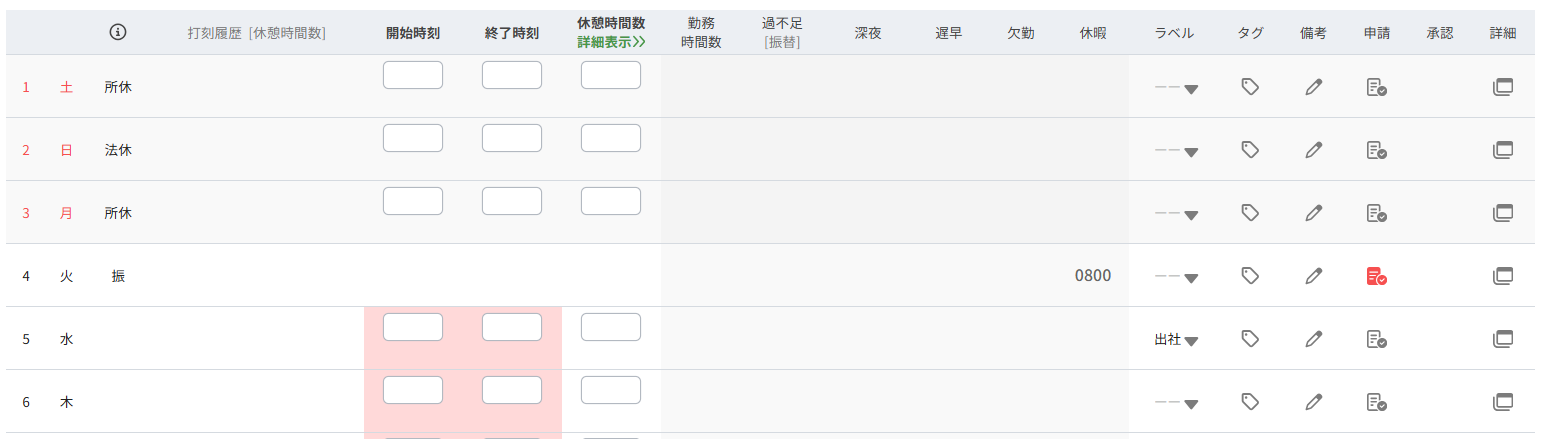 ④タイムカード入力画面の初期表示