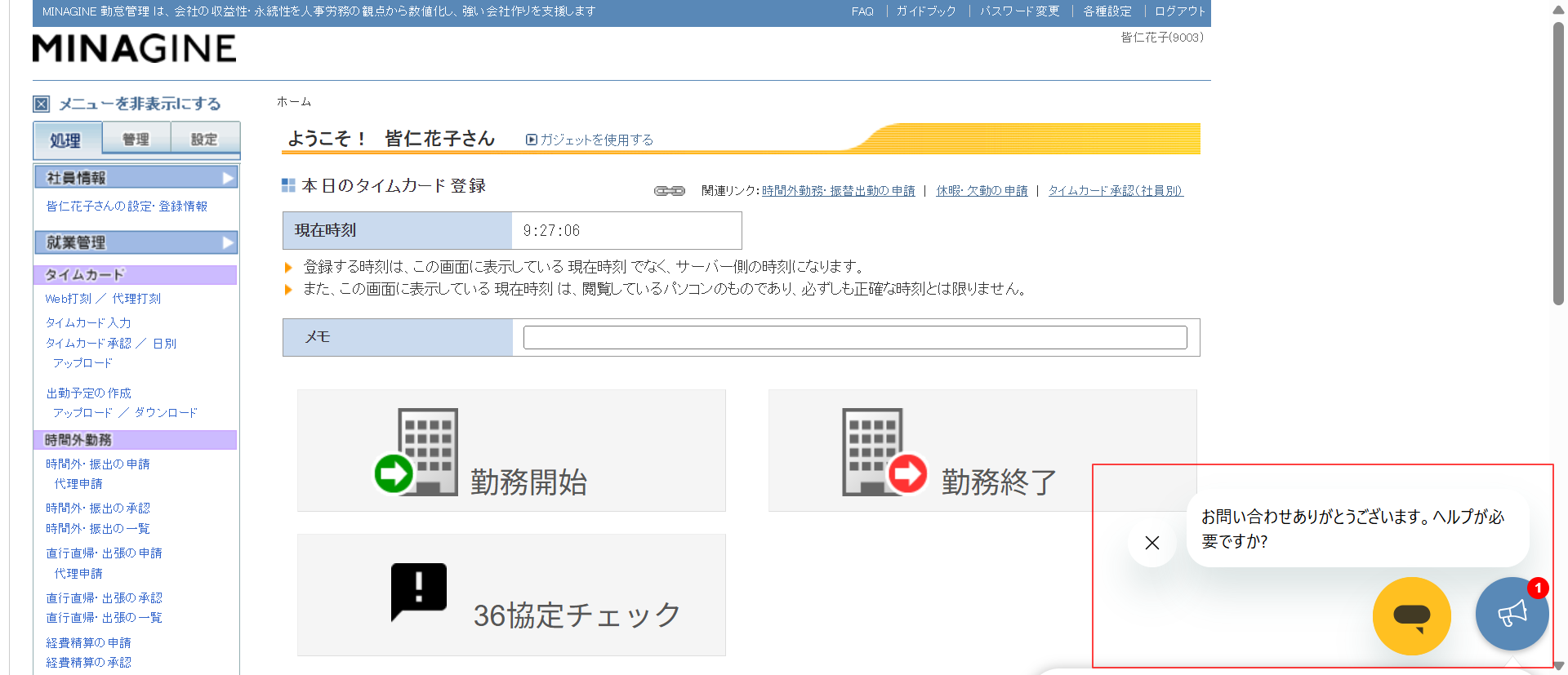 MINAGINE勤怠管理ヘルプサイトの右下のポップアップまたは、