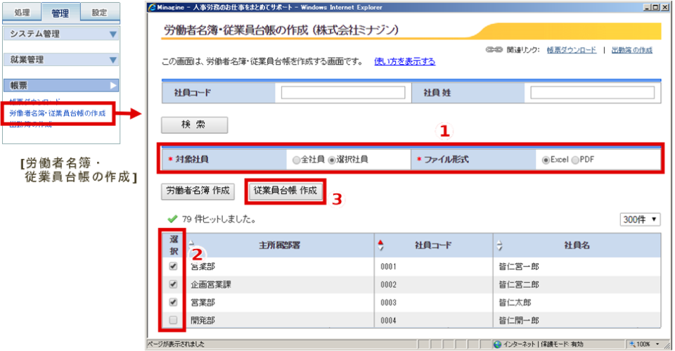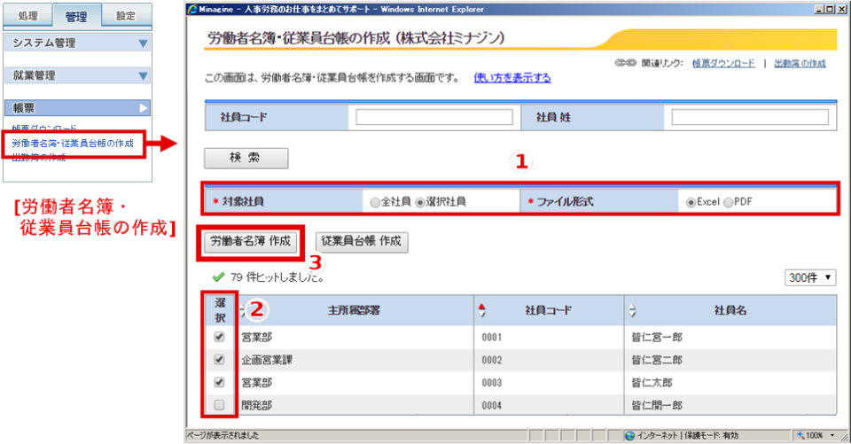 ①[労働者名簿・従業員台帳の作成]画面より、対象者を指定し、出力します。